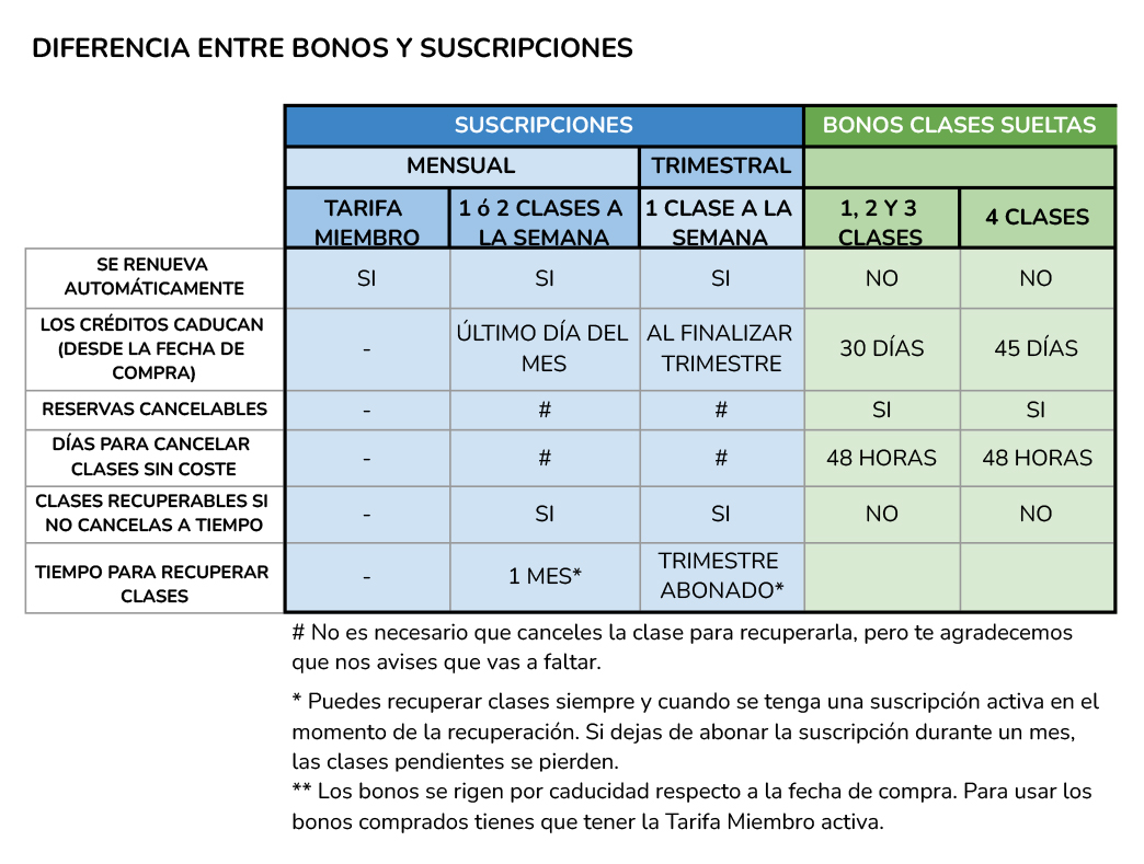 - Continuidad: Si un mes no abonas ninguna Tarifa Miembro, y tenías clases pendientes del mes anterior que no utilizaste, esas clases se pierden.