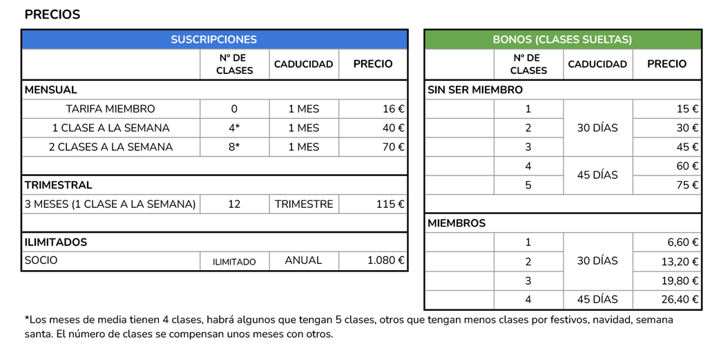 Pero, te recomendamos que te hagas Miembro de la Asociación por 16€/mes, para que estos precios se conviertan automáticamente a 6,60€ por clase.